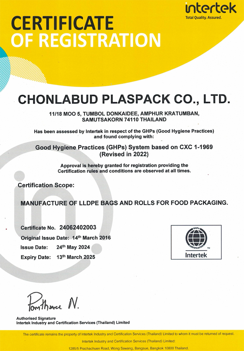 บริษัท ชลบุษบ์ พลาสแพค จำกัด มีมาตรฐานความปลอดภัยในการผลิตและบริการ ด้วยการรับรองระบบ ISO9001 และ GHPs เพื่อสร้างความประทับใจสูงสุดแก่ลูกค้าของเรา